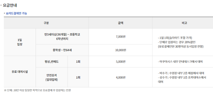 울산아쿠아시스 이용료 : 대인1만원, 소인 7천원, 36개월 미만 영유아 무료 (카드결제만 가능)