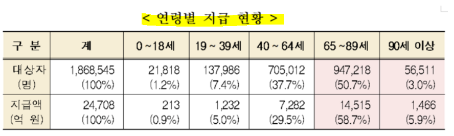 지난해 대상자의 85%는 소득하위 50% 이하이며, 전체의 53.7%는 65세 이상이 해당되었습니다.